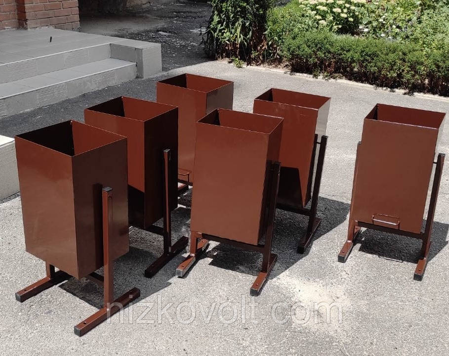 Урна виготовлена із сталевого листа 1,2 мм, труби 20х20 мм і пофарбована коричневою порошковою фарбою RAL.
