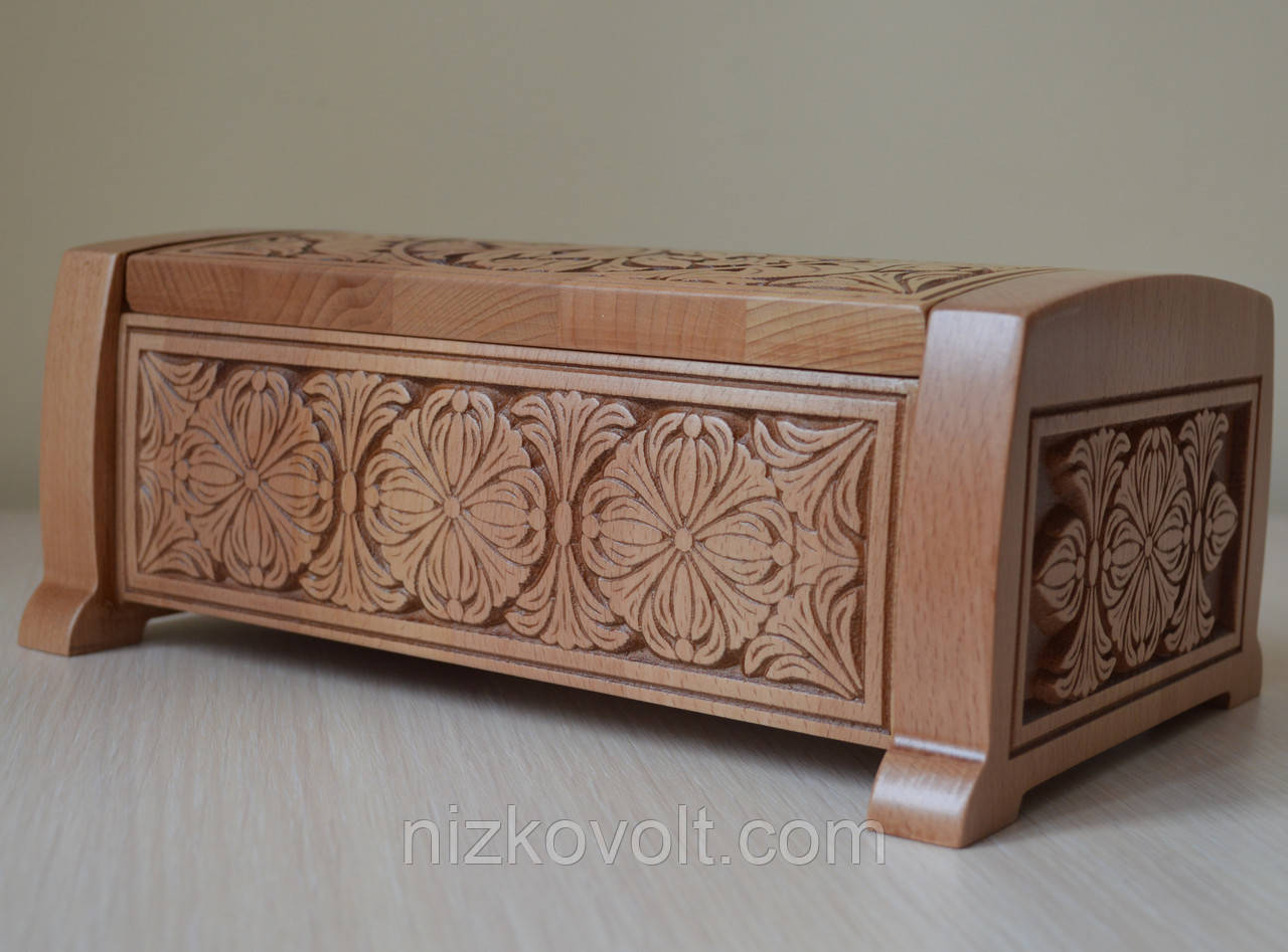 Шкатулка дерев'яна, виготовлена методом гравірування на верстаті з ЧПК з міцної дошки бука. Будь-яка жінка буде в захваті, побачивши такий шкатулки. Ніші шкатулки - мають гарний дизайн і відмінна якість. Натуральної деревини приписують виключно позитивну, сильну біоенергетику. Різьблені шкатулки з бука, стануть відмінним доповненням інтер'єру і, свого роду, певною візитною карткою вашої квартири або будинку. Вони відмінно виглядають на будь-якій полиці або в шкафу. Поєднуючи в собі міцність і естетичність, бук є і вифсокоекологічним оздоблювальним матеріалом.